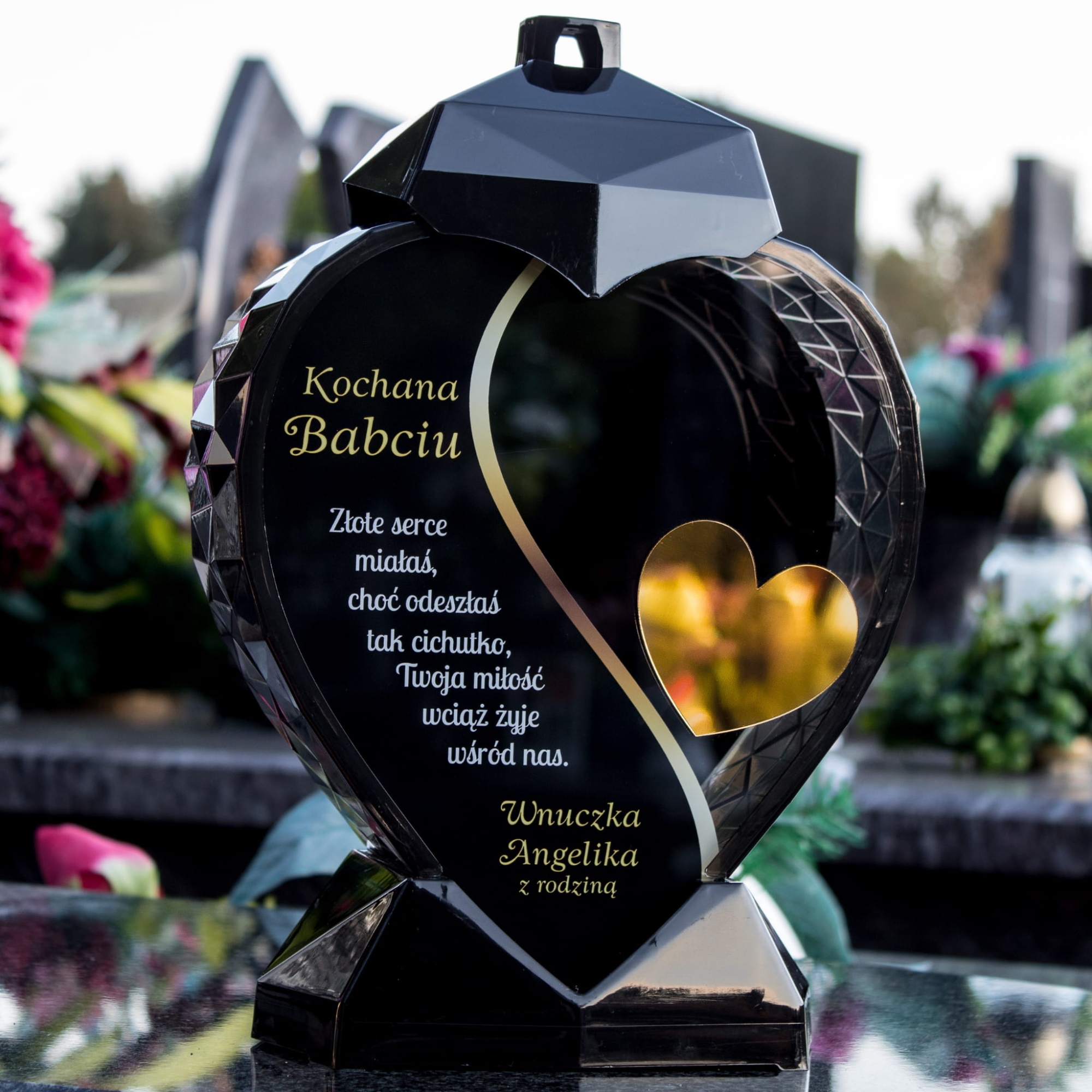 Znicz ma formę przestrzennego serca z ozdobnym wycięciem w kształcie złotego serduszka oraz eleganckim grawerem po lewej stronie. Piękne słowa: „Złote serce miałaś, choć odeszłaś tak cichutko, Twoja miłość wciąż żyje wśród nas” – są ponadczasowym wyrazem uczuć, których nie da się zapomnieć. Poniżej znajduje się personalizowany podpis, np. „Wnuczka Angelika z rodziną”, który sprawia, że znicz staje się prawdziwie osobistym symbolem pamięci.